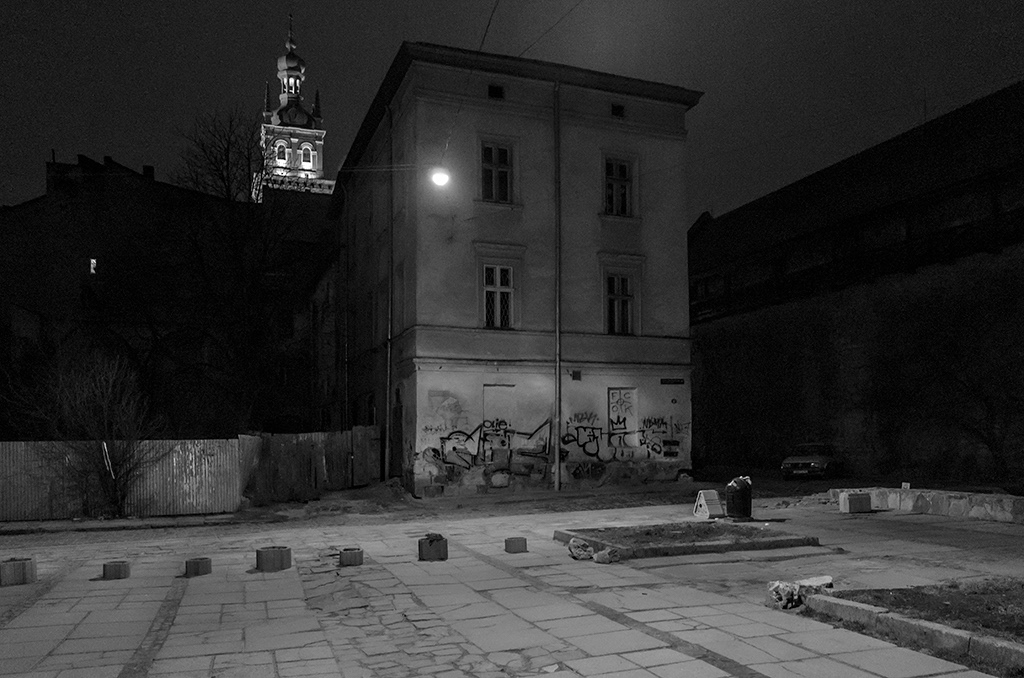 lviv is a good test case for the dynamics of this kind of reading. its situation today is almost the inverse of a city like kraków, whose abundant undestroyed jewish architectural patrimony is justly famous. in lviv, by contrast––for example in the krakivsky district just north of the main market square, a place whose jewish community dates to the fourteenth century––vacant lots correlate closely to sites of destroyed jewish religious buildings. if i put together a picture sequence of these empty spaces, it might begin like this: